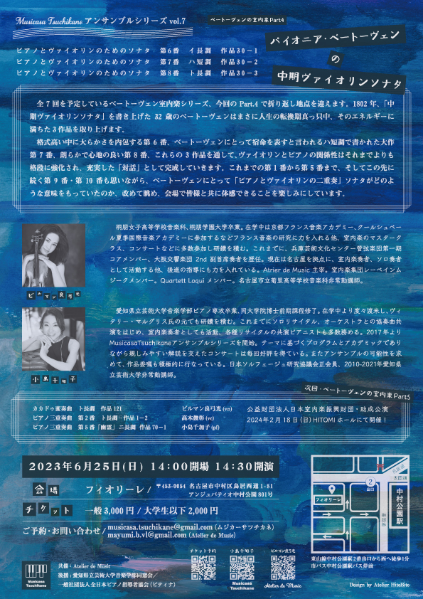 これまでの第1番から第5番まで、そしてこの先に続く第9番・第10番も思いながら、ベートーヴェンにとって「ピアノとヴァイオリンの二重奏」ソナタがどのような意味をもっていたのか、改めて眺め、会場で皆様と共に体感できることを楽しみにしています。